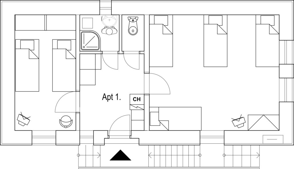 Apartmán 1 je priestranný a pohodlný apartmán s rozlohou 45 m², vhodný až pre 6 osôb. Poskytuje komfortné ubytovanie s vlastnou kúpeľňou, kuchynkou, televízorom a ďalším vybavením, ktoré vám spríjemní pobyt v Ružomberku a okolitej prírode Liptova.