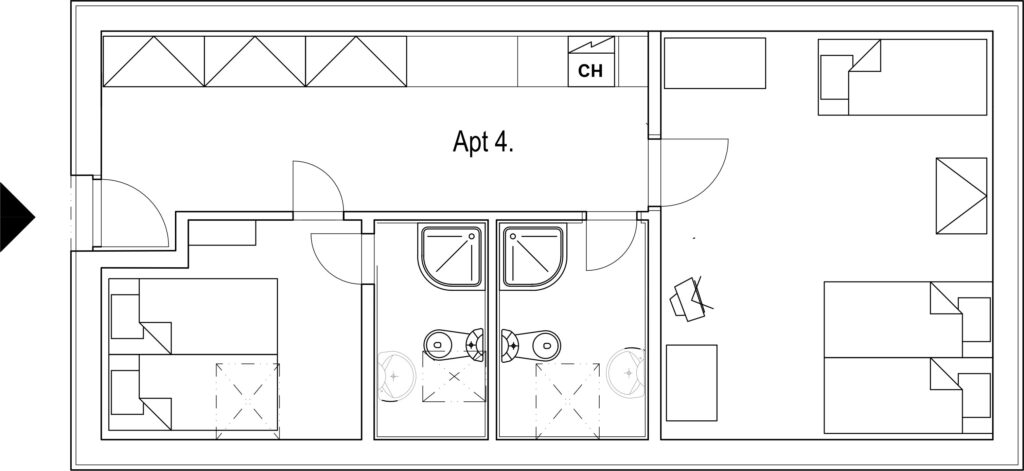 Apartmán 4 ponúka pohodlné a prakticky zariadené ubytovanie v pokojnom prostredí penziónu. Je vybavený vlastnou kúpeľňou, kuchynkou a príjemným priestorom na oddych, vďaka čomu je vhodný pre páry aj rodiny s deťmi. Apartmán poskytuje ideálne zázemie na relax po dni strávenom výletmi, športom alebo oddychom v okolí.